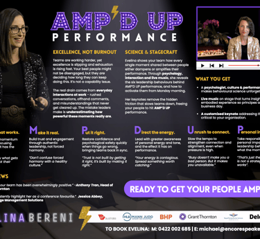 Today she’ll bring AMP’D UP performance to life by revealing how leadership energy and everyday interactions either slow the flow, or make it grow especially when the tempo is high.